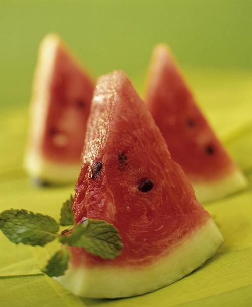 1. 西瓜:用刀在西瓜上划出十字,然后沿着划痕将西瓜分成四瓣,再用刀将每瓣西瓜切成小块。